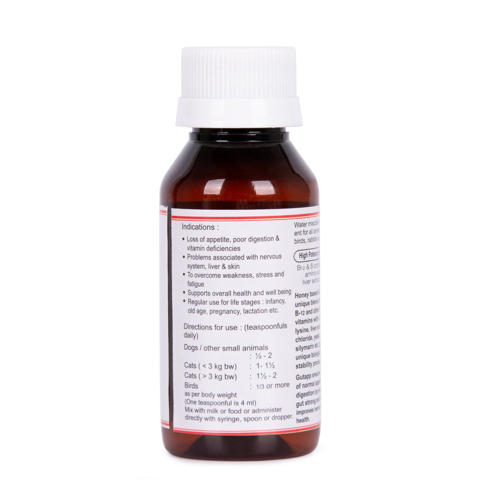 Boost your pet’s appetite and put them onto the path of good gut and cognitive health with Gutapp for overall health and wellness. The honey based GutApp is a unique blend of high potency B-12 and other B-complex vitamins with L-tyrosine, L-lysine, liver extract, choline chloride, yeast, curcumin, silymarin etc. produced by a unique biological formulation stability process. Heating is carefully avoided to preserve the valuable heat sensitive biochemical vitamins. The  efficacy of GutApp has been established by comprehensive scientific trials carried out in the field situation.