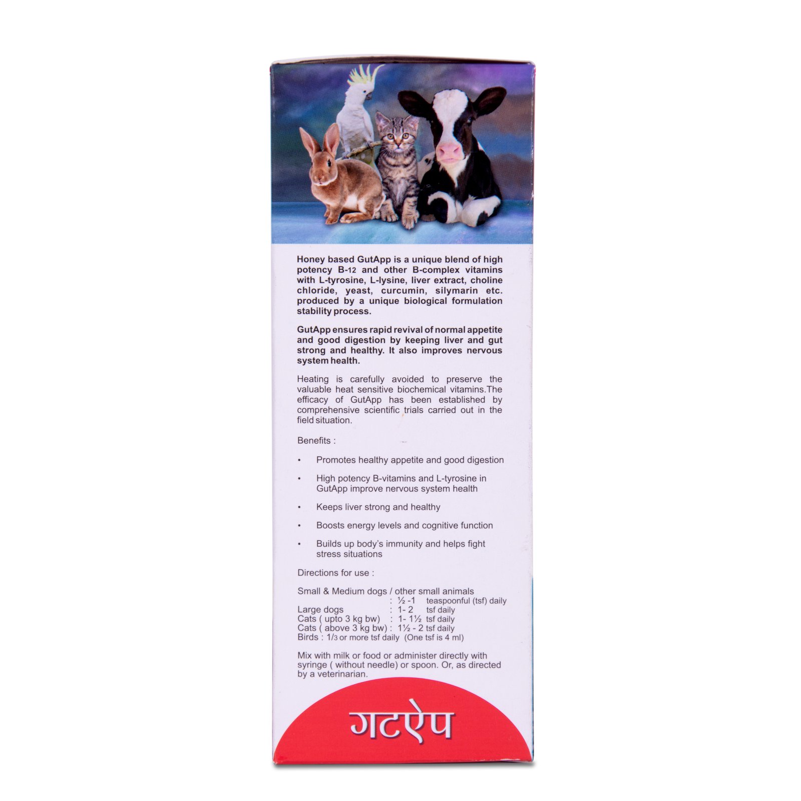 Boost your pet’s appetite and put them onto the path of good gut and cognitive health with Gutapp for overall health and wellness. The honey based GutApp is a unique blend of high potency B-12 and other B-complex vitamins with L-tyrosine, L-lysine, liver extract, choline chloride, yeast, curcumin, silymarin etc. produced by a unique biological formulation stability process. Heating is carefully avoided to preserve the valuable heat sensitive biochemical vitamins. The  efficacy of GutApp has been established by comprehensive scientific trials carried out in the field situation.